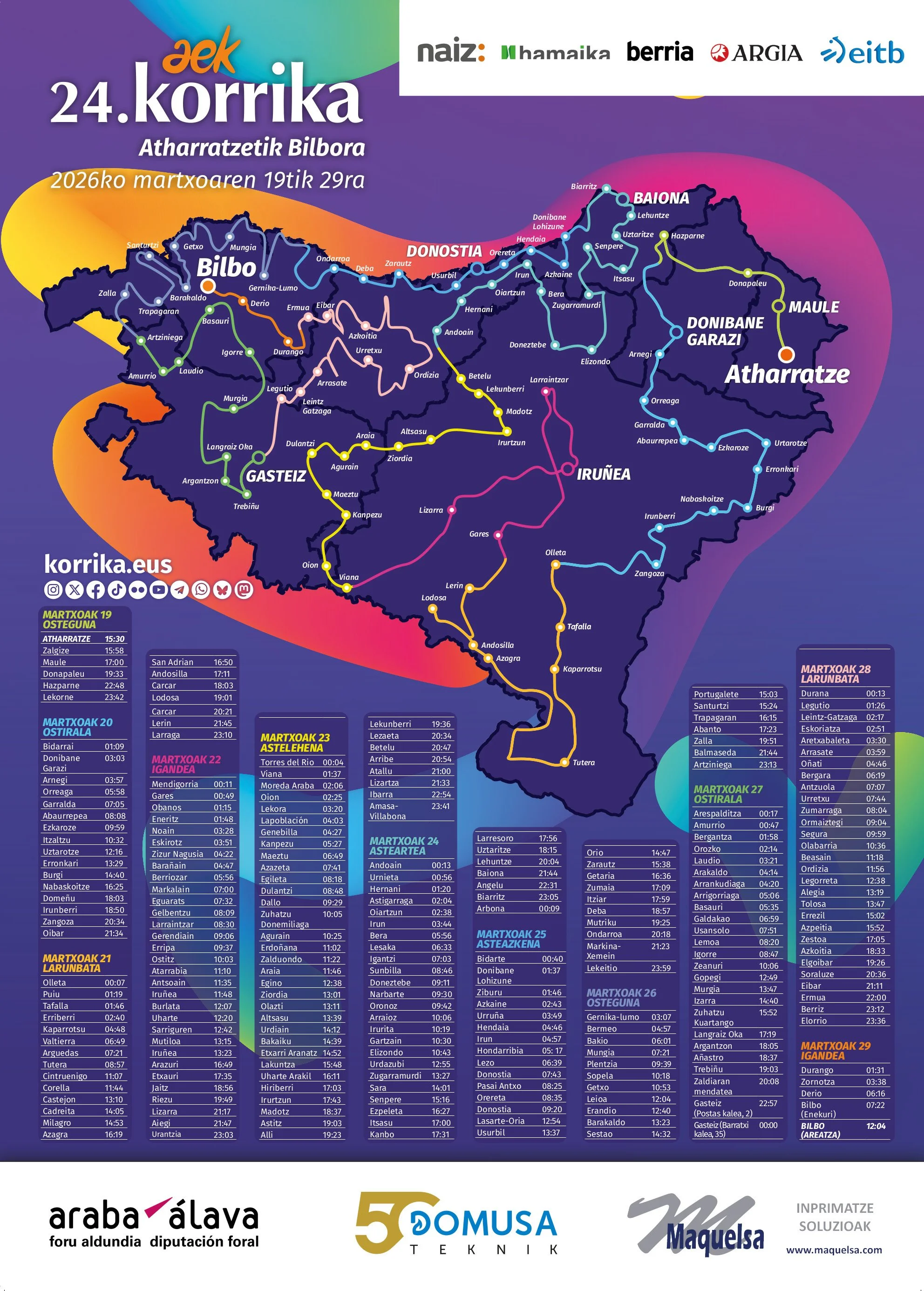 According to Korrika’s official website, KORRIKA is a popular race all around the Basque Country, organized by AEK, a popular Basque language school in the Basque Country, to promote the Basque language. Its objective is twofold: on one hand, to promote awareness of the language, and on the other to raise funds to enable the AEK Basque language schools to continue their everyday teaching work. There have now been 24 editions of KORRIKA in the last 45 years, and on 19th March, 2026 a new edition set off in the Basque Country, which will span more than 2,500 km over 11 days non-stop for the Basque language.